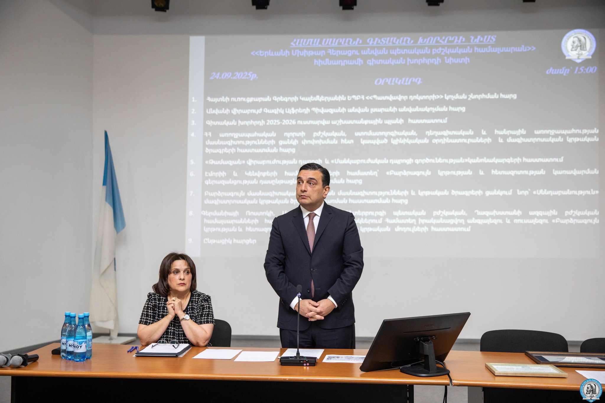 2025-2026 ուսումնական տարում Գիտական խորհրդի առաջին նիստը հագեցած էր շուրջ մեկ տասնյակ հարցերով։ Հանդիսավոր հատվածից մինչև աշխատանքային, կազմակերպչական, կարգապահական ու անվտանգային հարցեր գտնվում էին ուշադրության կենտրոնում։