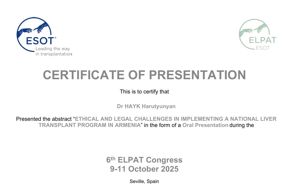 Ընդհանուր վիրաբուժության ամբիոնի դոցենտ, «Աստղիկ» բժշկական կենտրոնի վիրաբույժ Հայկ Հարությունյանը հոկտեմբերի 9-11-ը Իսպանիայի Սևիլիա քաղաքում մասնակցել է ELPAT կոնգրեսին (European Platform on Ethical, Legal and Psychosocial Aspects of Transplantation) և հանդես է եկել զեկույցով՝ ներկայացնելով «Հայաստանում լյարդի փոխպատվաստման ծրագրի իրականացման ընթացքում էթիկական և իրավական մարտահրավերները» թեման։